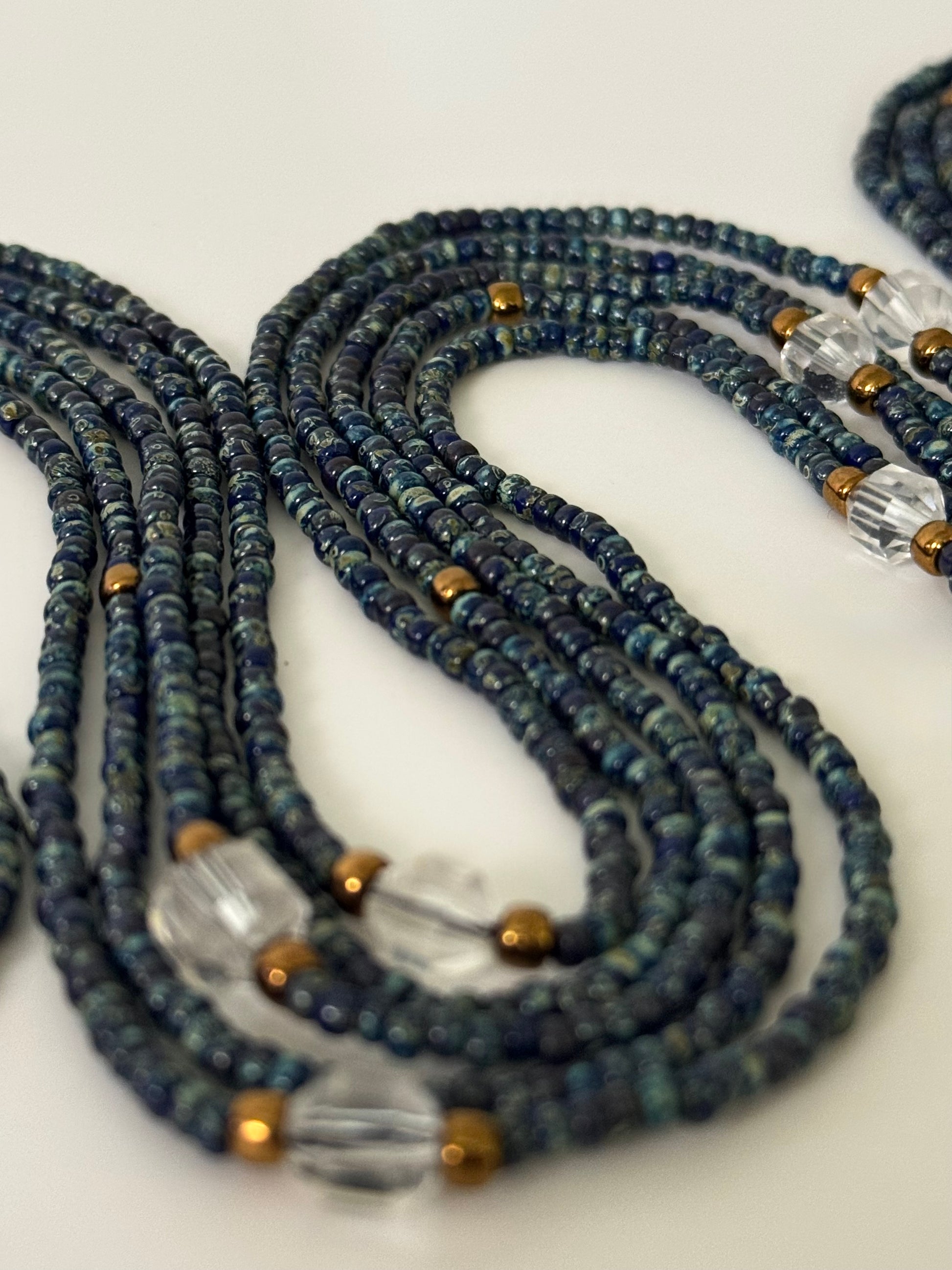 Inspired by the timeless power of jeans and a white tee, Divine Denim is for the woman who’s walked through the fire and came out glistening in gold. Featuring denim, blue beads accented with golden touches and infused with clear quartz, the master healer, this strand is a whole mood: calm, centered, and untouchably radiant.