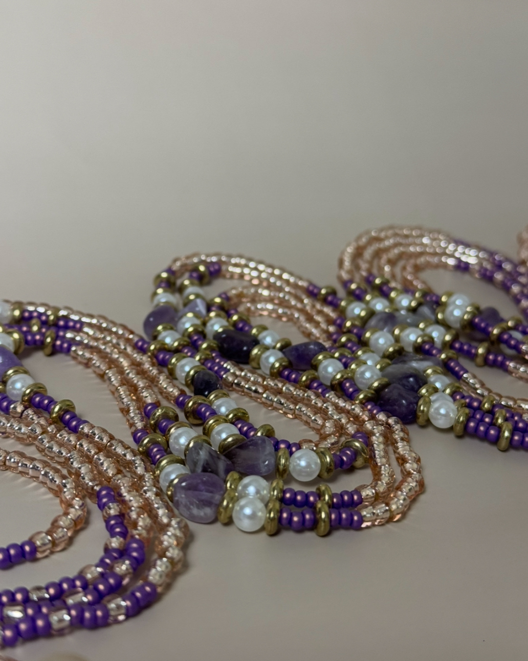 Embrace the healing power of self-love and resilience with our Golden Serenity Waist Beads. Designed with the strength and beauty of survivors in mind, this stunning piece features a harmonious blend of gold beads, purple accent beads, pearls, and amethyst.